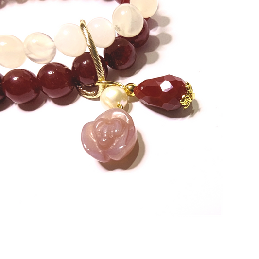 White Moonstone and Ruby Quartz Double Layer with Flower Charm