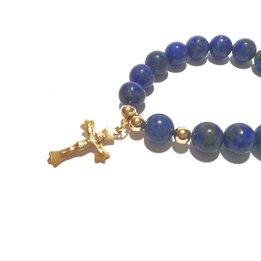 Lapis Lazuli rosary bracelet in 10K spacers and stainless Cross