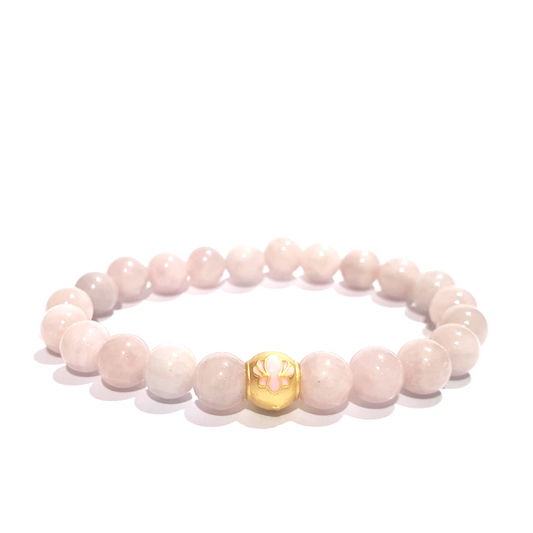 Rose Quartz and lotus jade rosary bracelet in 10K spacers and stainless Cross