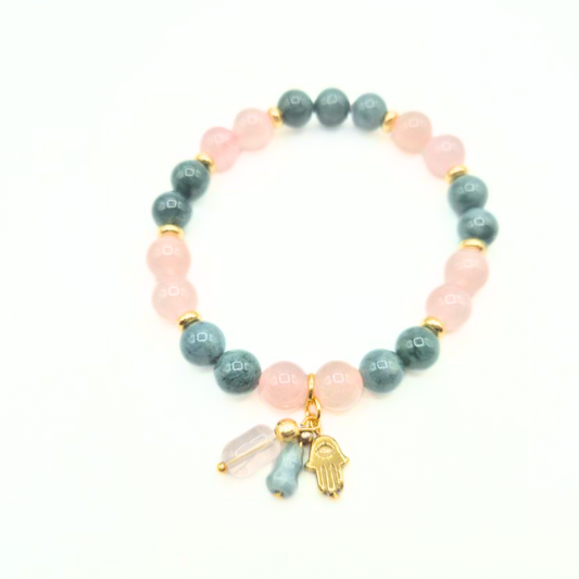Love and Abundance | Rose Quartz and Blue Water Jade with Jade Wulou and Hematite Hamsa Charm