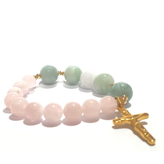 Rose Quartz and lotus jade rosary bracelet in 10K spacers and stainless Cross