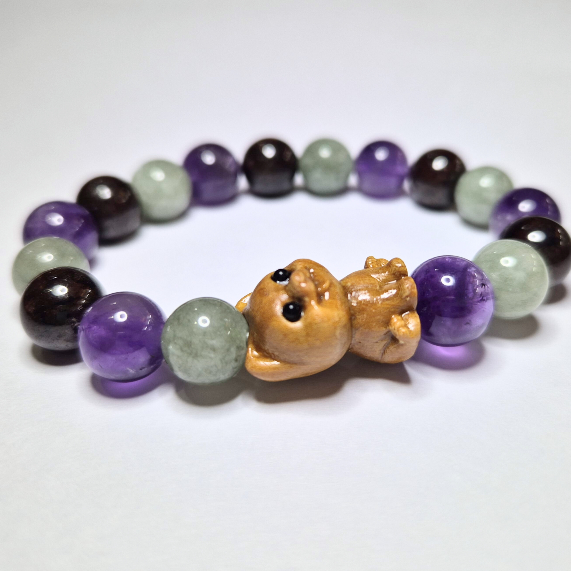 Chinese Zodiac Collection | Dog Wooden Carving Genuine Amethyst, Tiger Eye, and Garnet Crystal Bracelet (Beadsize: 10mm)