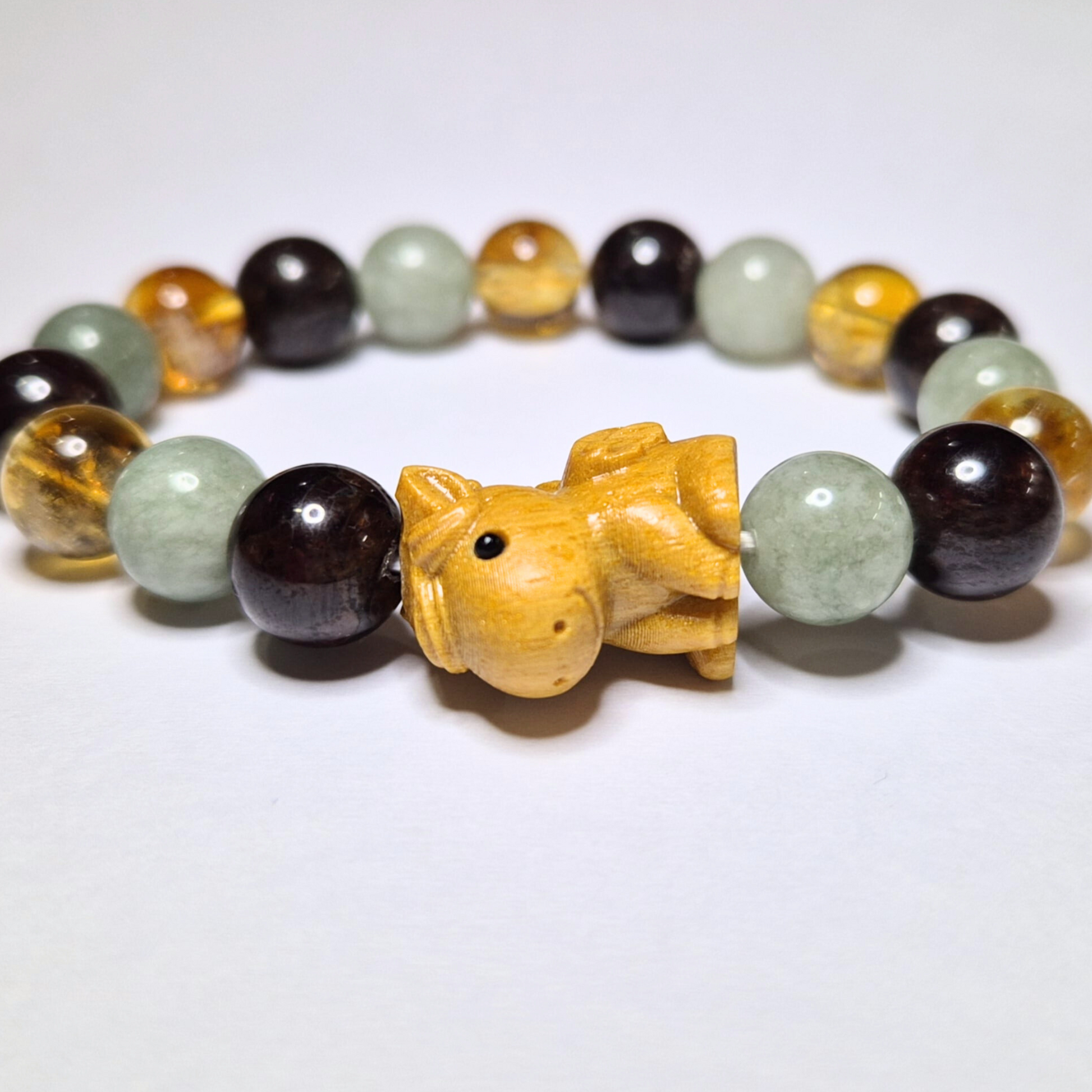 Chinese Zodiac Collection | Horse Wooden Carving Genuine Citrine, Jade, and Garnet Bracelet (Beadsize: 10mm)