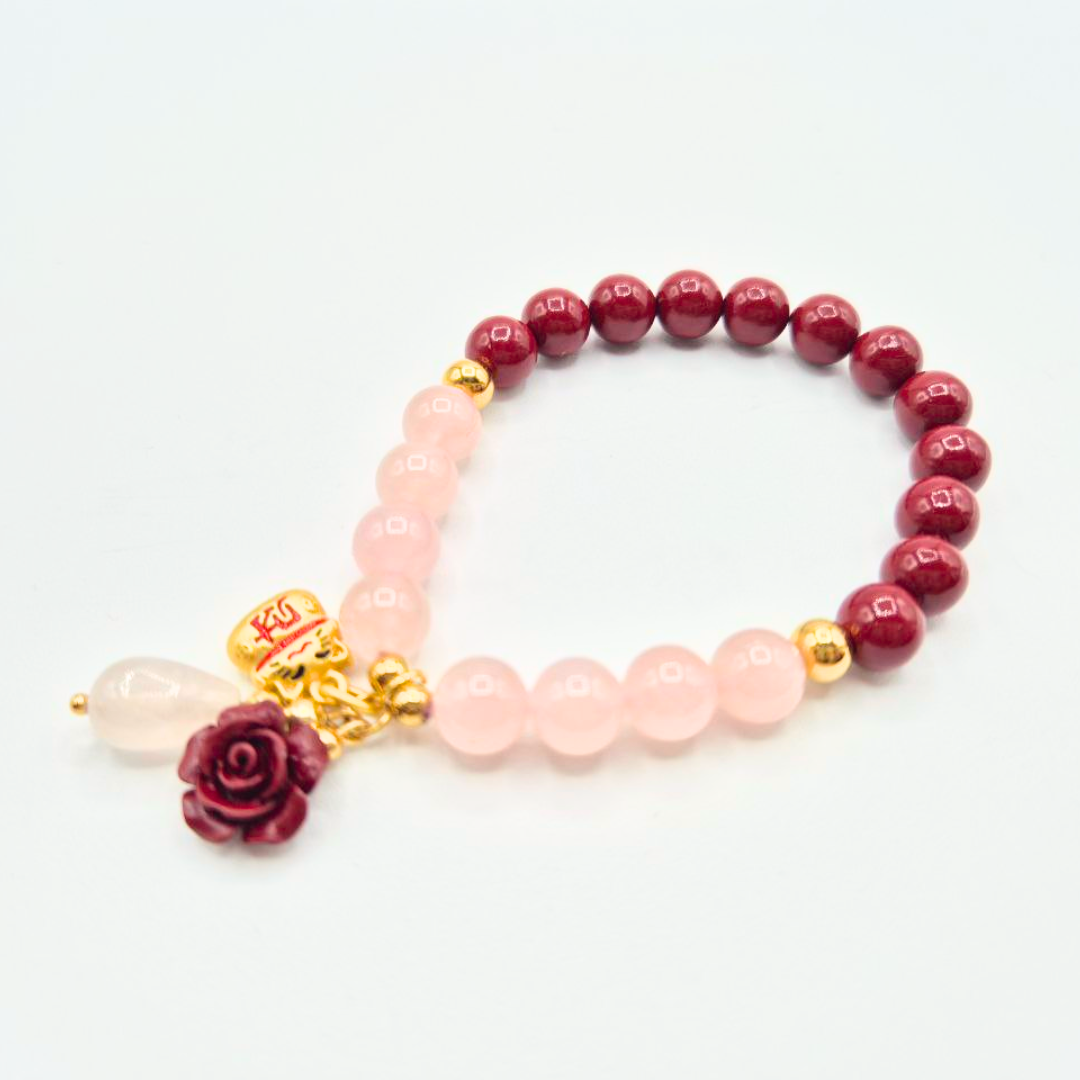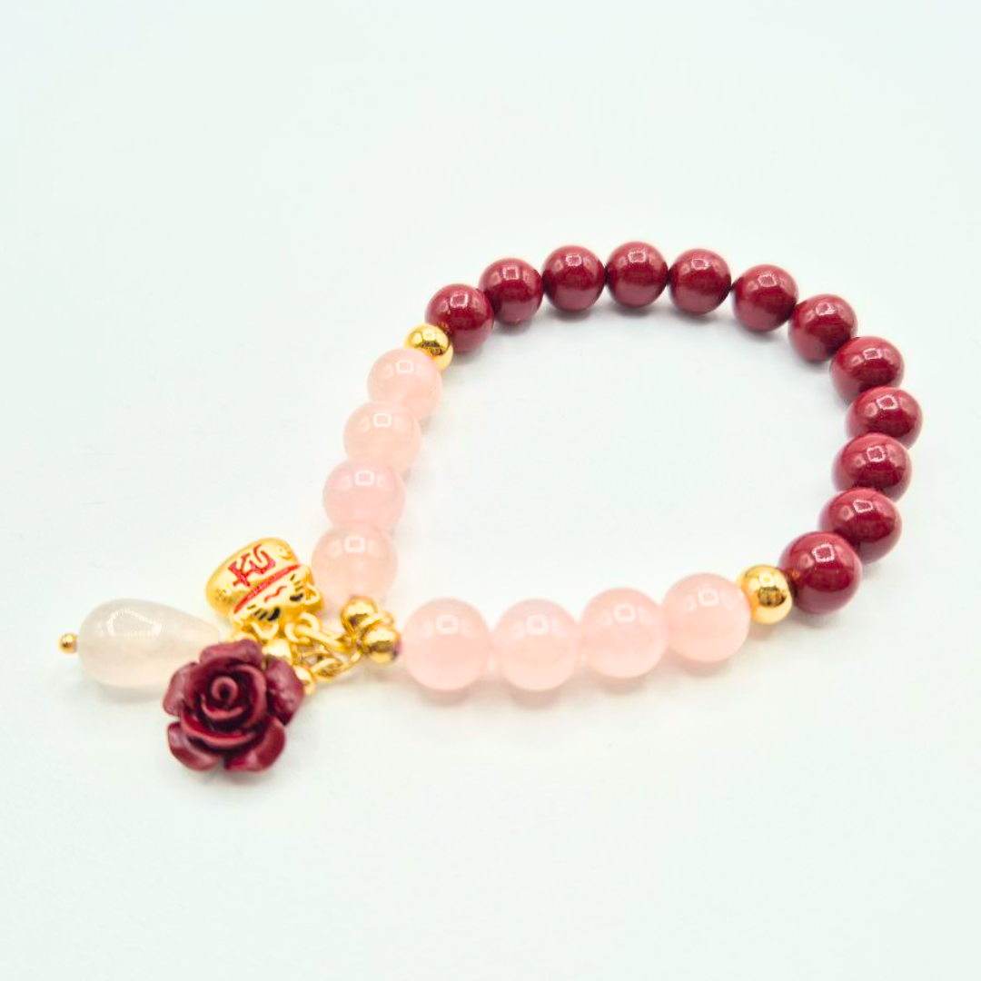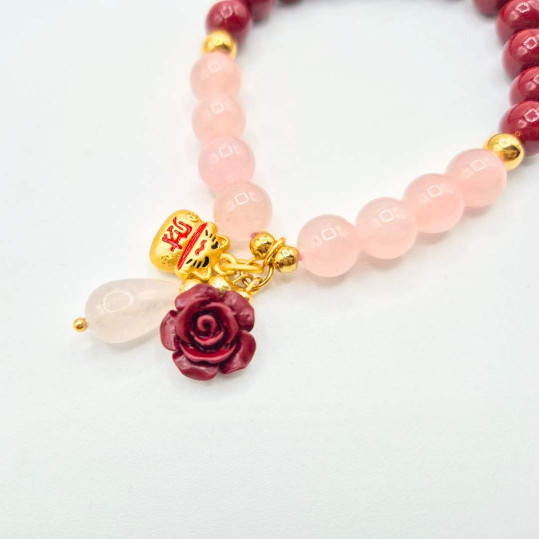 Love and Protection | Rose Quartz and Cinnabar with Cinnabar Rose, Rose Quartz Accent, and Lucky Cat Charm
