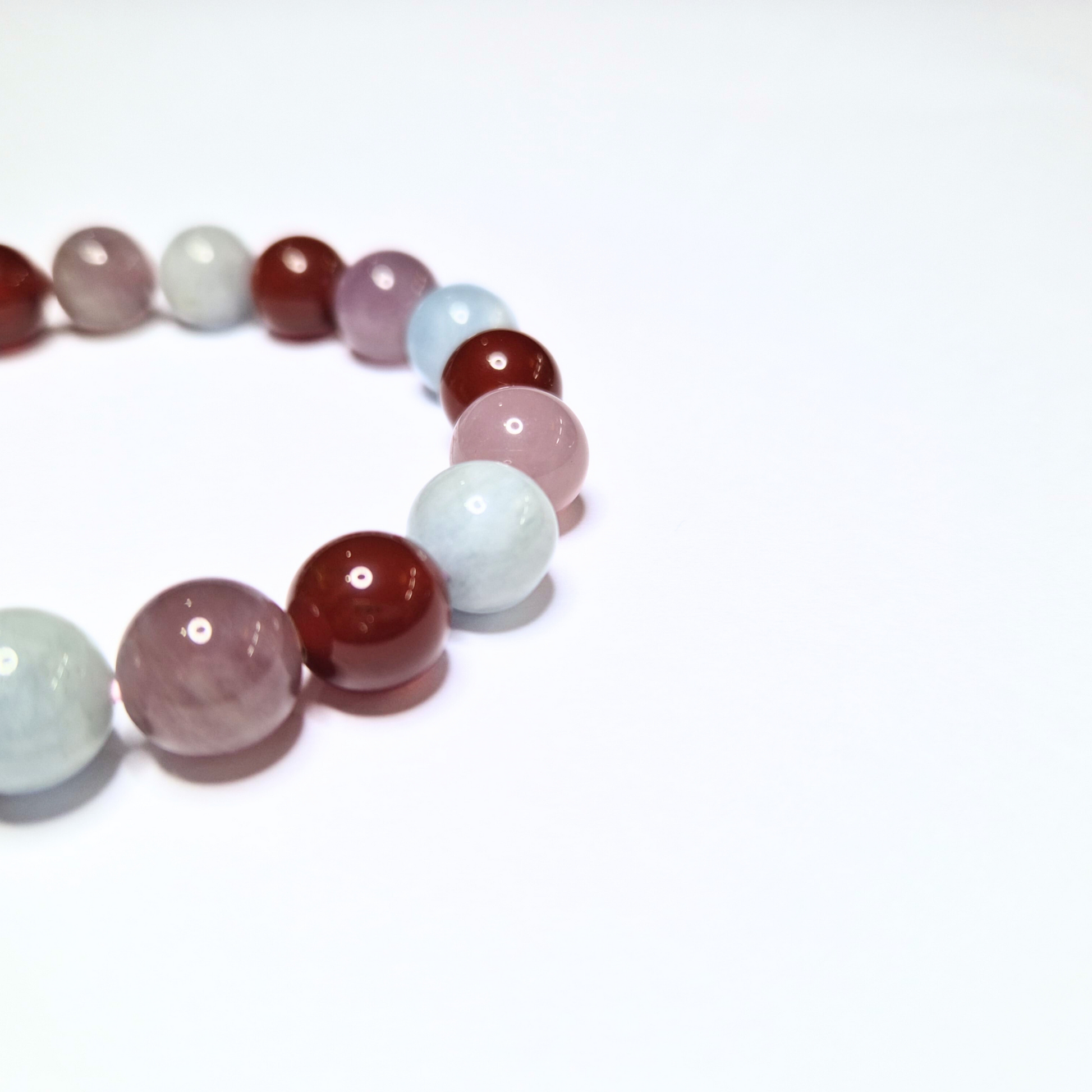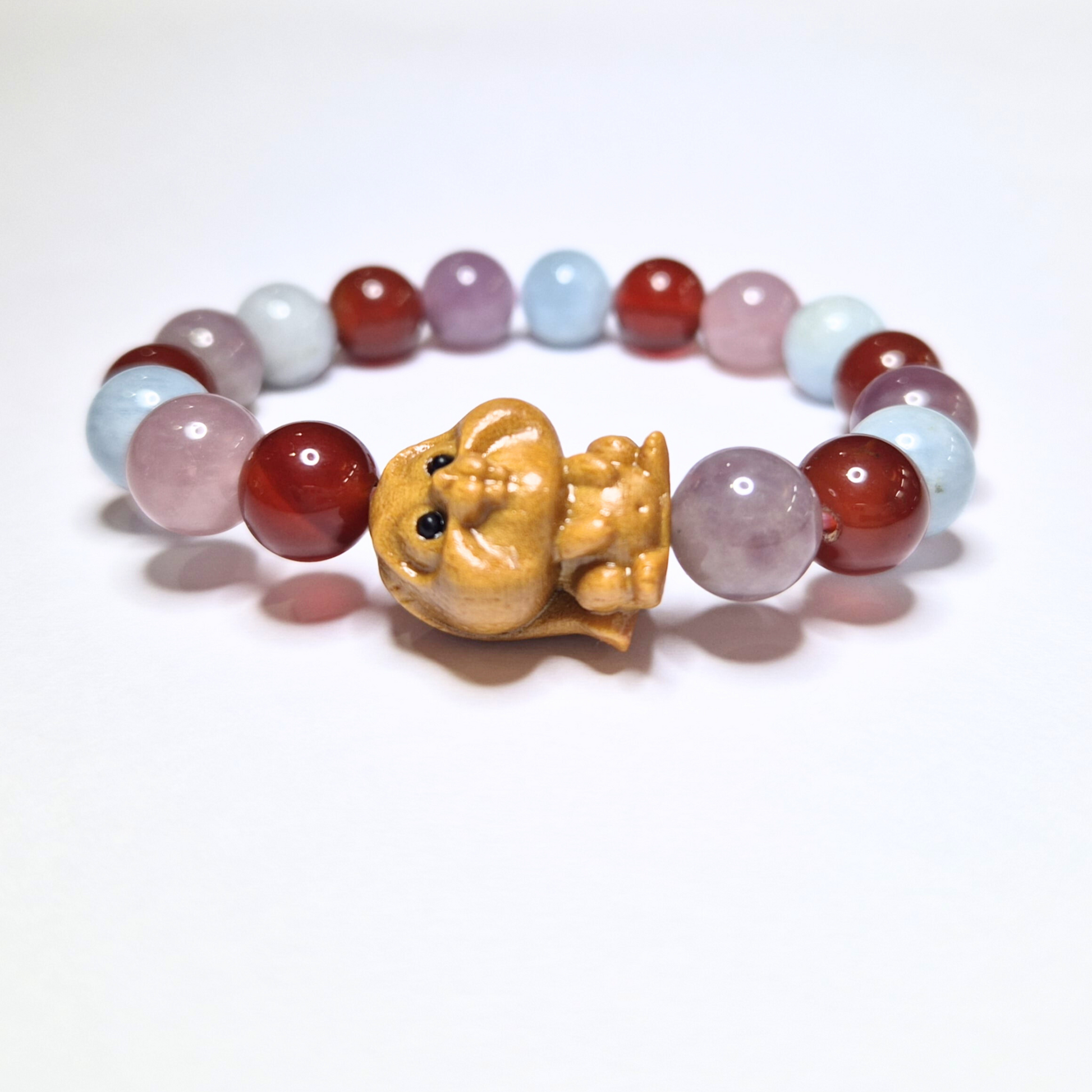 Chinese Zodiac Collection | Rabbit Wooden Carving Genuine Purple Rose Quartz, Red Agate, Aquamarine Crystal Bracelet (Beadsize: 10mm)