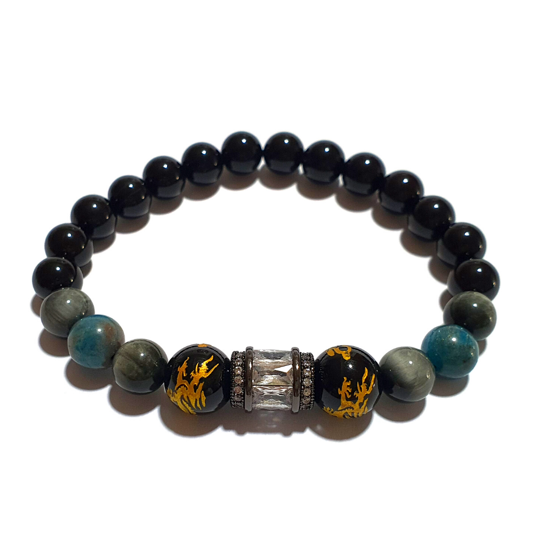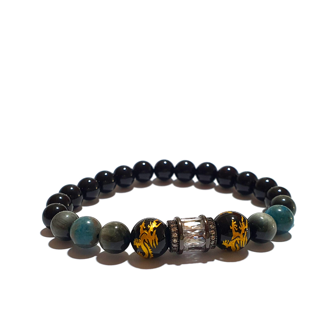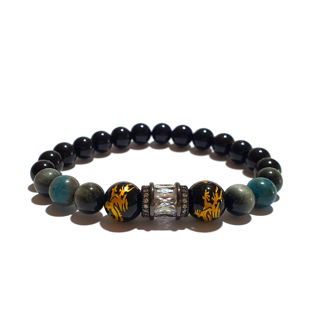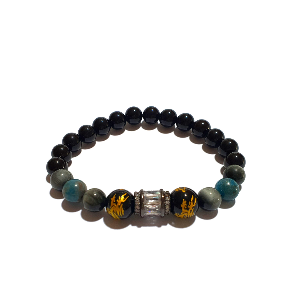 This bracelet contains the following crystals that help connect one's self to the universe by enhancing wisdom, intellect, and confidence with additional protection from onyx.